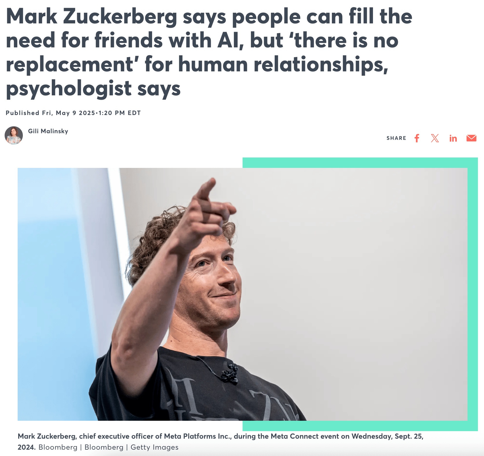 Mark Zuckerberg—the same guy who built an empire on connecting people—suggested that AI could fill the gaps in our friendships. 😳